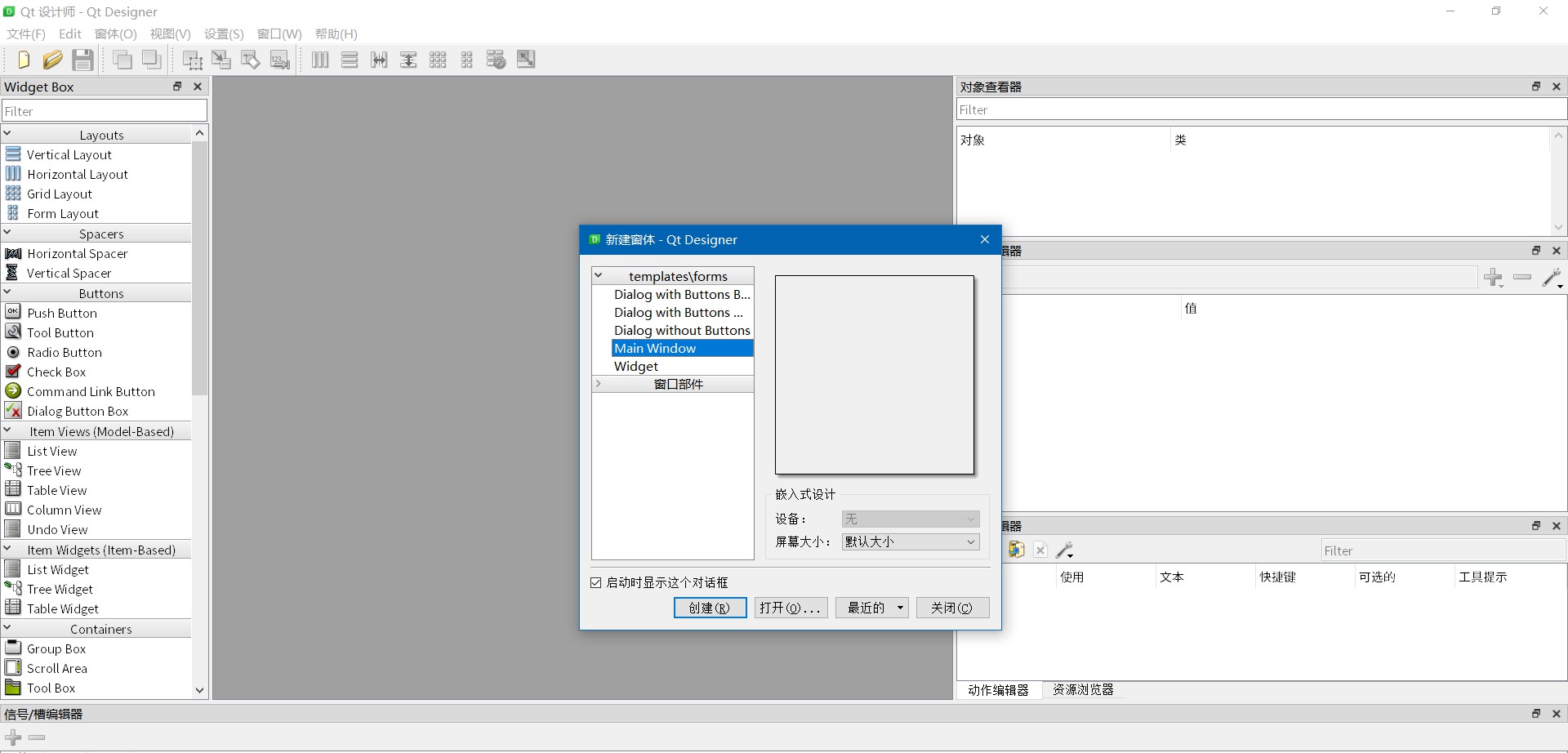 用QT Designer设计UI 在GUI方面我用的是QT Designer来辅助设计,这样所见即所得的体验很好。 哦对了,要QT Desinger的安装使用和汉化如果有需求的话可以参考我的这篇文章 。 打开后大概是这个样子的,这里我们一般用 Main Window 这一项,因为这个会自动附带上工具栏和状态栏,一般还是比较好用的